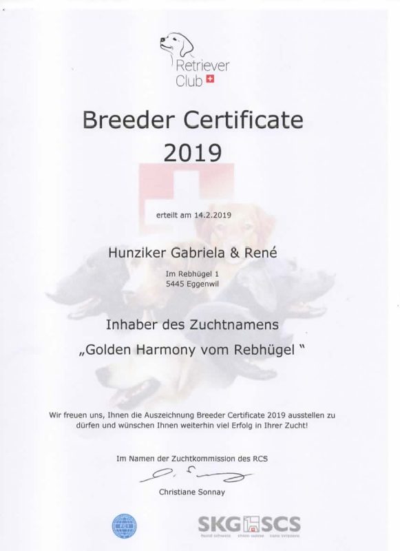 SKG Goldenes Gütezeichen und RCS Breeder Certificate 2019
